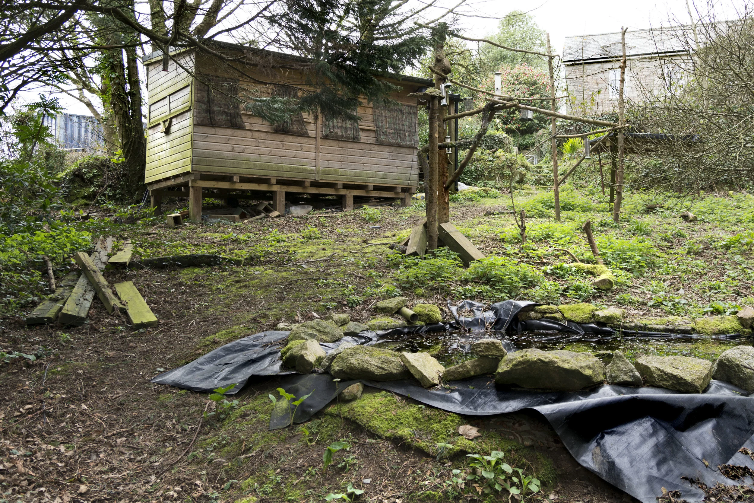 Surrounding are perches and bird feeders to attract wildlife. The shed is padlocked, not in use today.